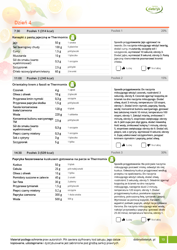 Kompleksowy, 30 dniowy program dietetyczny dla WEGETARIAN z przewagą dań na THERMOMIX. Jadłospis oparto o produkty pochodzenia roślinnego z niewielkim dodatkiem produktów mlecznych i jaj. Dieta została skomponowana przez zespół dietetyków specjalizujących się w tematyce diety wegetariańskiej. Ta bardzo urozmaicona, niezwykle pożywna i wyjątkowo smaczna dieta zadowoli każdego, kto szuka zdrowych i wartościowych dań wegetariańskich. Pod względem odżywczym w diecie położono w szczególności nacisk na podaż takich składników jak białko, żelazo, witaminy grupy B oraz wiele minerałów których często brakuje w dietach roślinnych. Dieta idealnie nadaje się dla osób, chcących też spróbować takiego modelu żywienia.